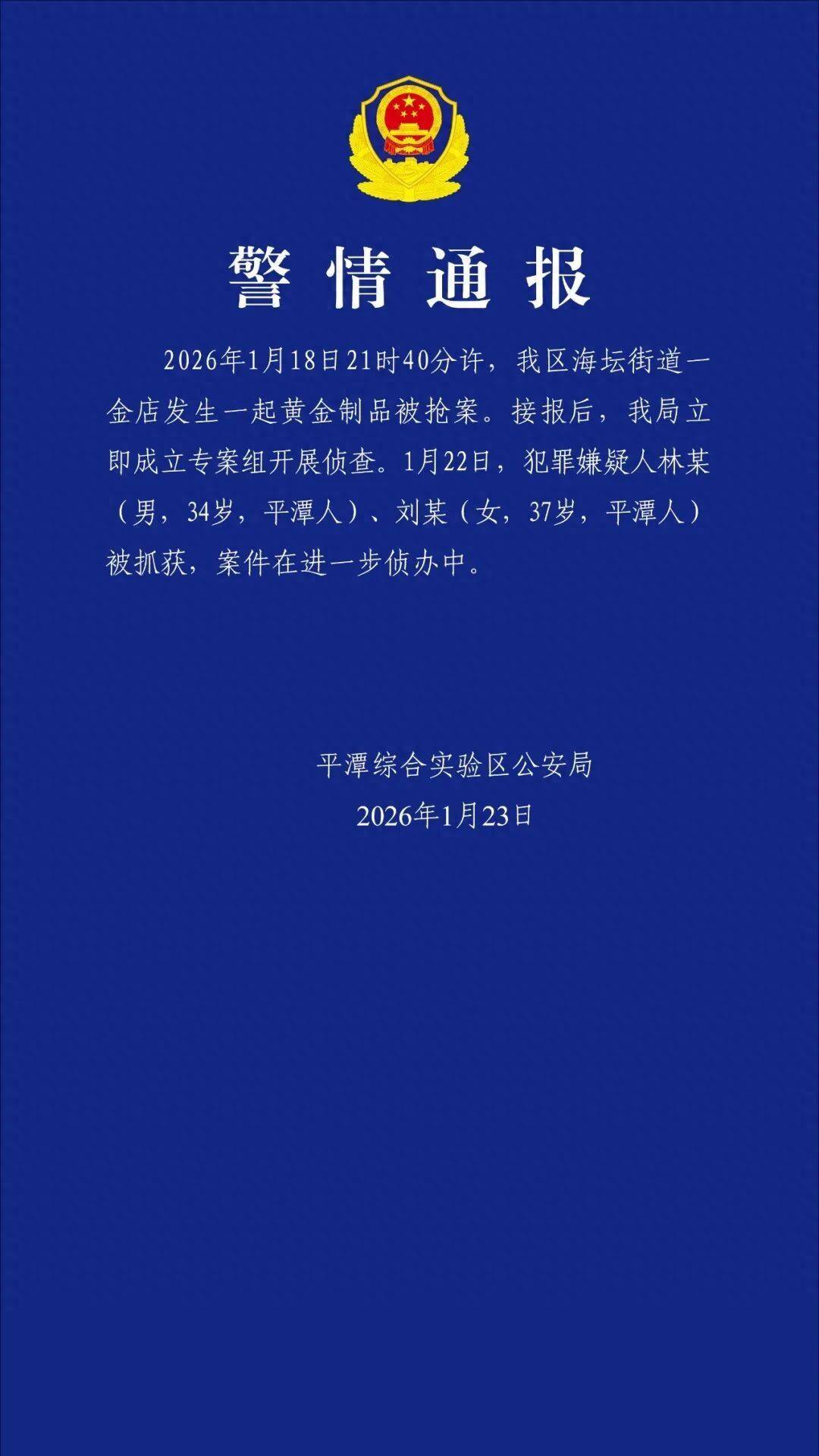 2026年1月18日21时40分许,我区海坛街说念一金店发生一王人黄金成品被抢案。接报后,我局立即建造专案组开展观看。1月22日,坐法嫌疑东说念主林某(男,34岁,平潭东说念主)、刘某(女,37岁,平潭东说念主)被握获,案件在进一步侦办中。