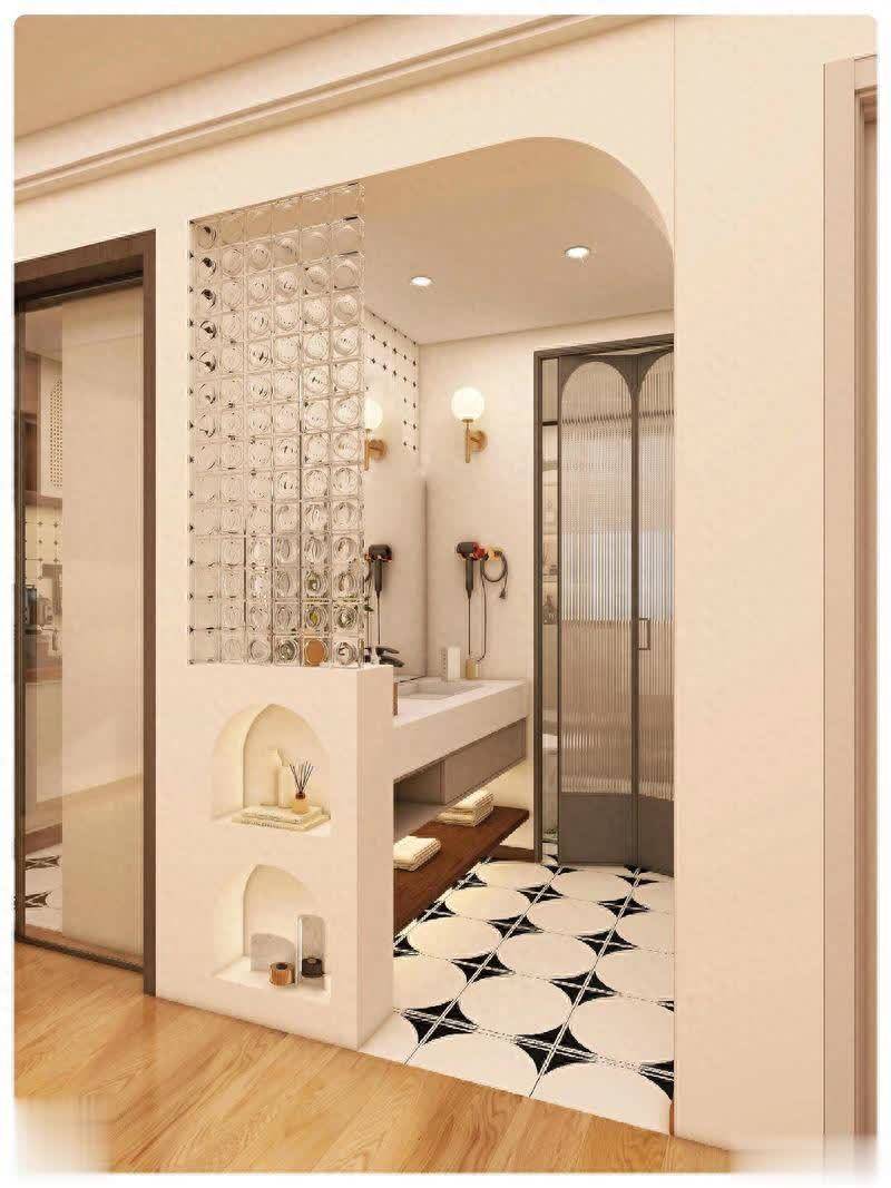 这堵“半墙”,到底妙在哪儿?简言之,即是把洗手台区域的墙只砌一半(时常高度在1.1米 - 1.2米傍边),上方留出空间。你或者在不少网红案例中见过,以为是营造“氛围感”的利器。但内容上,它的优点相称着实: