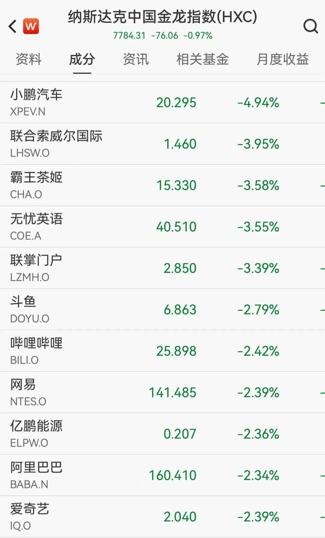 热点中概股庞杂着落,纳斯达克中国金龙指数跌近1%。小鹏汽车跌近5%,阿里巴巴、哔哩哔哩、网易、爱奇艺跌超2%。