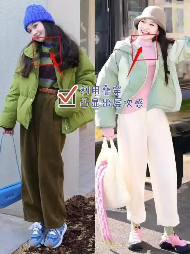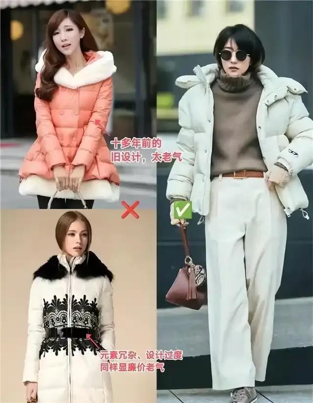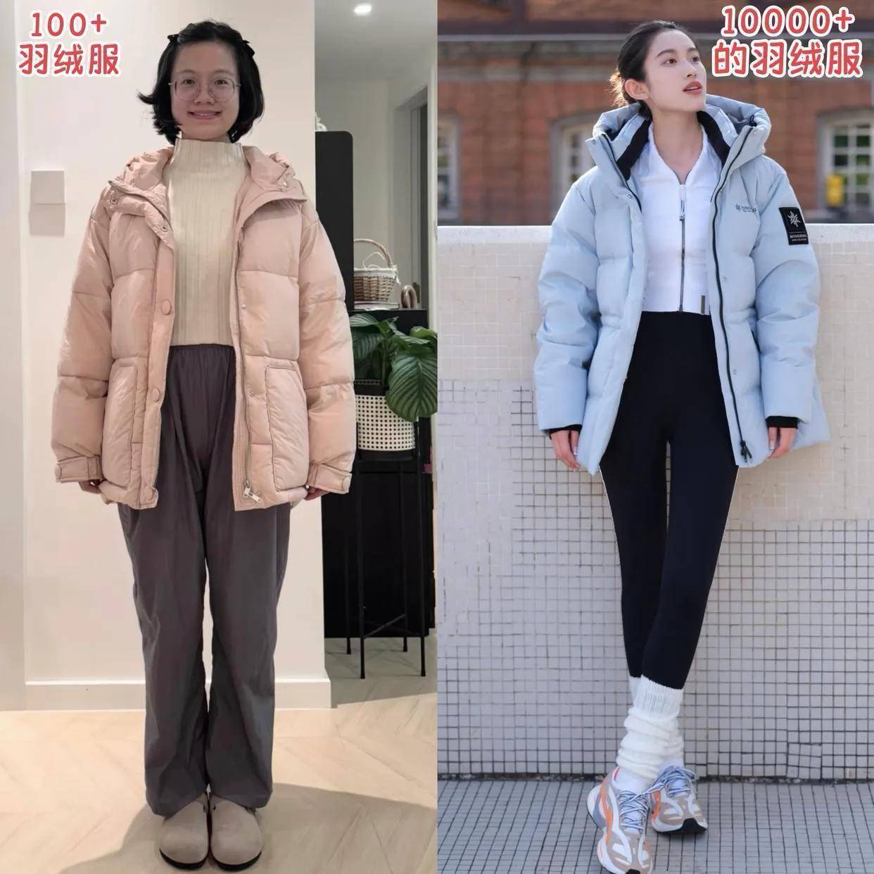 好的,羽绒服和差的羽绒服眼其实就能看得出来,我们就说上头这2套穿搭吧,粉色的羽绒服及褶皱,况且不修饰肩颈线条,穿在在身上很掉价。