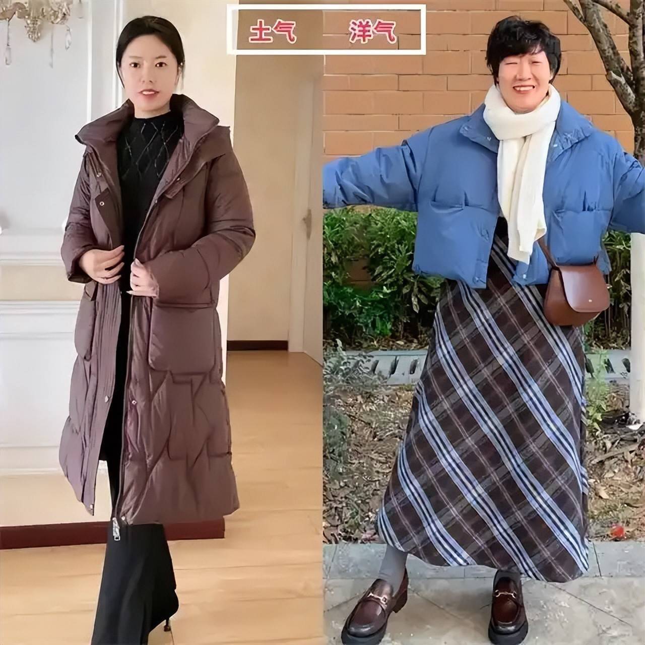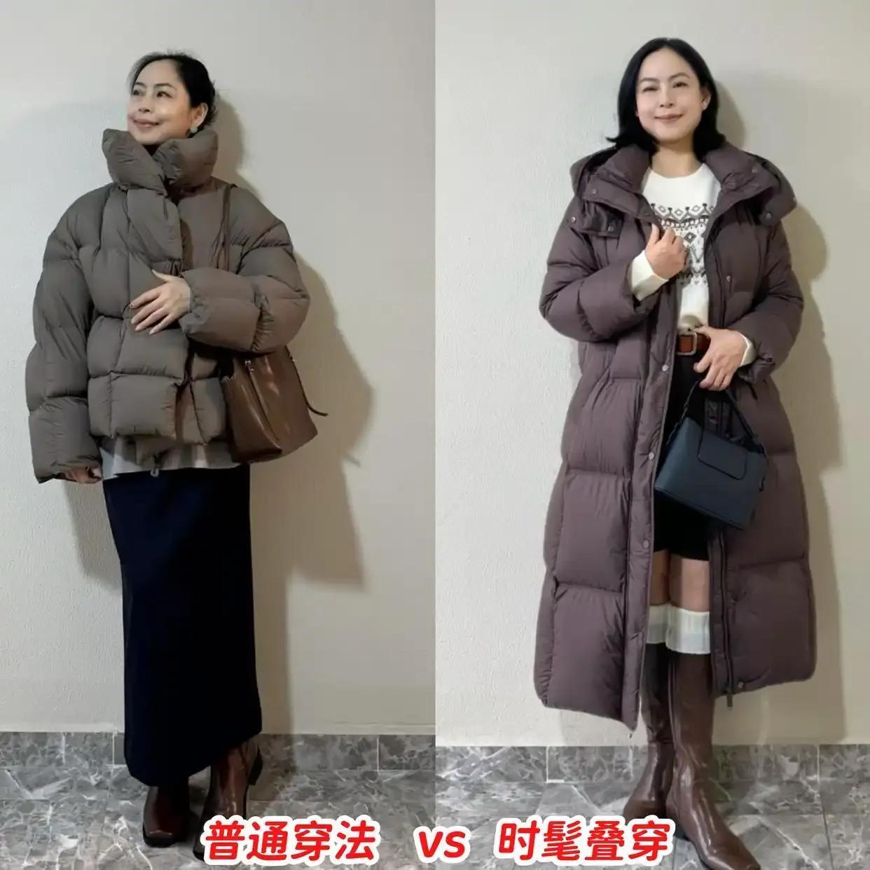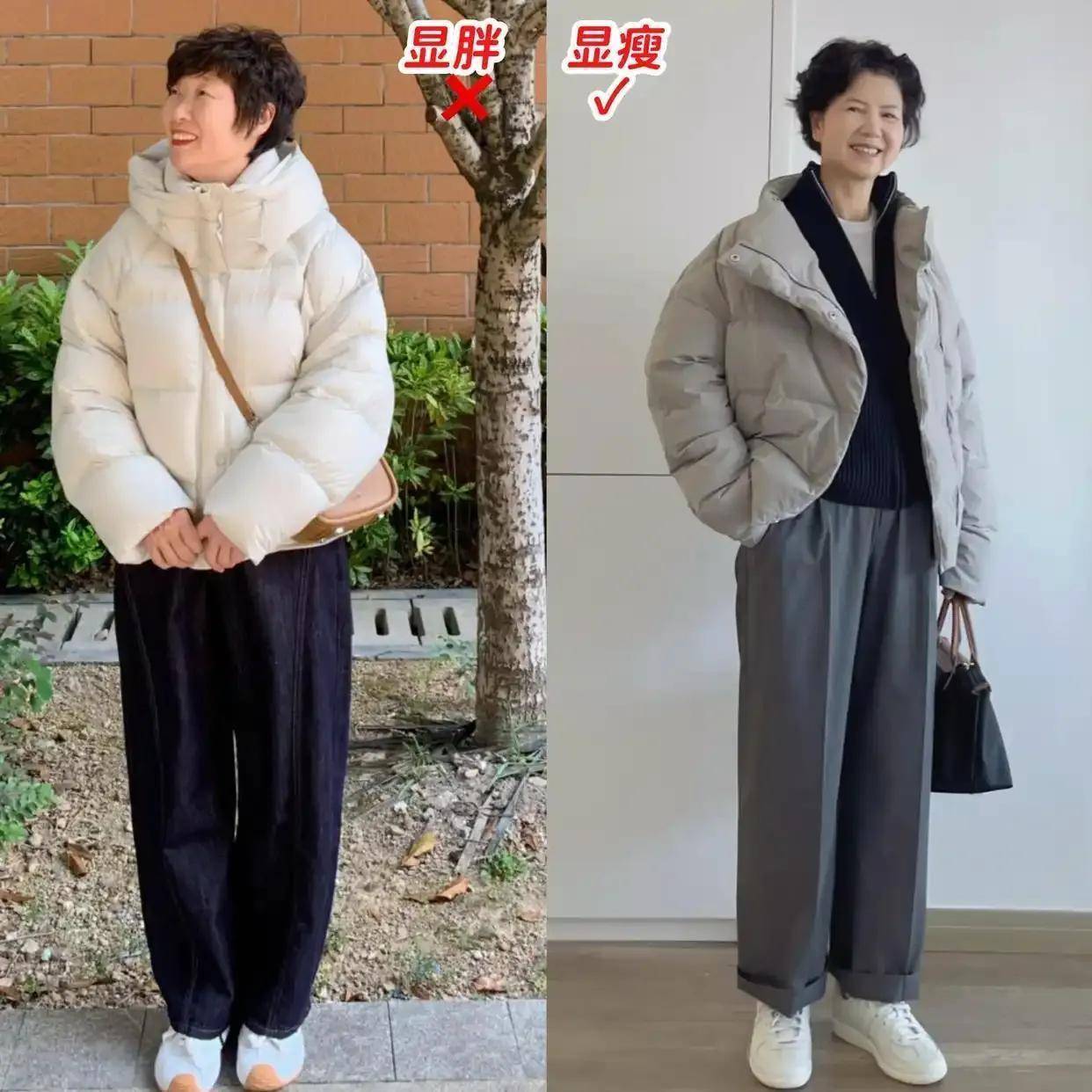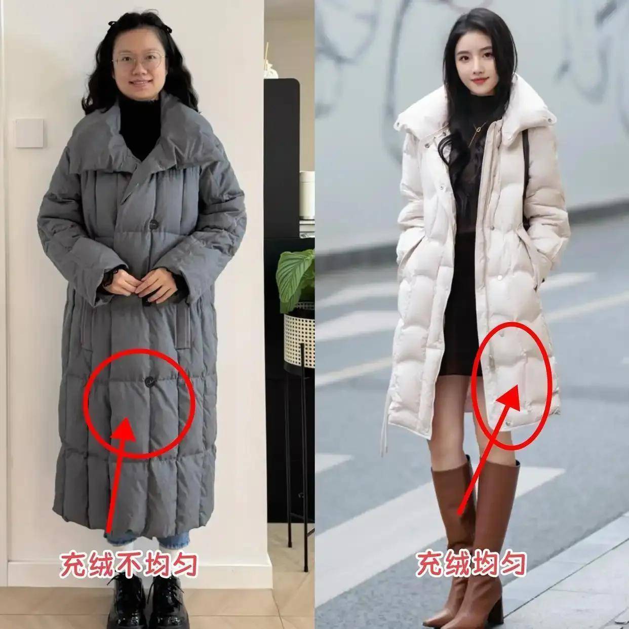 其实我们不错遴选像右边这件灰色的羽绒服,蓬松感适中,穿在身受骗然能显瘦,况且也能作念到御寒的截至。