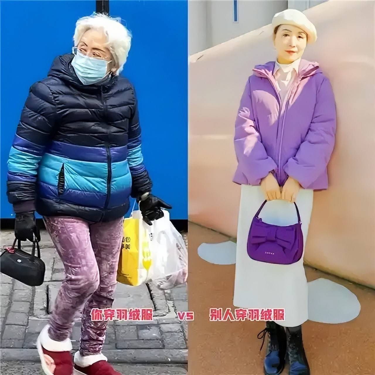 第一章节:中年女性慎重以下三种羽绒服搭配规律,尽量躲避①:不穿花里胡梢棉服